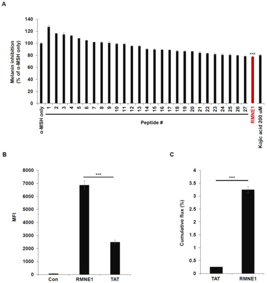 Using CPPs for melanin inhibition screening in B16F10 cells. (A) Melanin inhibition was tested after incubating B16F10 with α-MSH (50 nM) and CPPs (20 μM) for 72 h. As a positive control, 200 μM of Kojic acid was used. Melanin contents were measured at optical density (OD) 405 nm. (B) B16F10 cells were treated with 2.5 μM of FITC-conjugated RMNE1 for 2 h. The mean fluorescence intensity (MFI) of the cells was determined via flow cytometry analysis. FITC-conjugated TAT was used to compare the uptake efficiency. (C) Franz diffusion cells and artificial membranes were used to test the skin penetration effect. Totals of 500 μL of 1 mM FITC-conjugated RMNE1 and TAT were placed in the donor compartment of Franz cells for 24 h. Penetrated peptides were collected from the receiver compartment, and the concentrations of each sample were calculated using a fluorescence reader. Results are presented as mean ± SD (standard deviation), and statistical significance was analyzed with Student’s t-test (*** p < 0.001).
