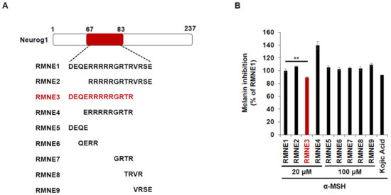 In this study, we identified RMNE1 and DualPep-Shine, peptides with anti-pigmenting activity derived from human Neurog1. Neurog1 belongs to a family of basic helix–loop–helix transcription factors that regulate the differentiation of ganglion neurons during development [36,37]. Considering that Neurog1 is mainly expressed during neuronal differentiation and is seen at very low levels in other tissues, it is unclear whether Neurog1 has an endogenous function in melanocytes [38,39]. The anti-pigmenting activity and nucleus localization of RMNE1 and DualPep-Shine may provide a clue for Neurog1 biology in melanocytes, but the precise mechanism for the anti-pigmenting activity and biological function should be further investigated.