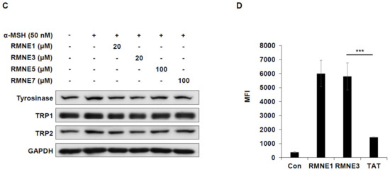 2.2. RMNE1 and Its Derivatives Inhibit Melanin Synthesis by Suppressing Melanogenesis-Related Enzymes