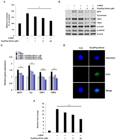 DualPep-Shine regulates the expression of melanogenic genes and inhibits the promoter activity of MITF-M. (A) B16F10 cells were treated with various concentrations of DualPep-Shine for 72 h. Melanin contents were determined at OD 405 nm. (B) DualPep-Shine was treated with α-MSH for 24 h, and whole-cell lysates were subjected to Western blotting. Indicated antibodies were used to analyze melanogenic proteins. (C) mRNA levels of MITF, Tyr, TRP1, and TRP2 were analyzed using quantitative polymerase chain reaction (qPCR) after treatment with DualPep-Shine for 12 h. The gene expression was normalized with β-actin. (D) FITC-conjugated DualPep-Shine was treated for 2 h on B16F10 cells, and its localization was visualized using confocal microscopy. Hoechst 33342 was used for nucleus staining. Bar = 10 μm. (E) Luciferase reporter assay was performed to check the promoter activity of MITF-M. Cells were transfected with MITF-M promoter construct and treated with DualPep-Shine for 8 h. The results are presented as mean ± SD, and statistical significance was analyzed with Student’s t-test (** p < 0.01, *** p < 0.001).