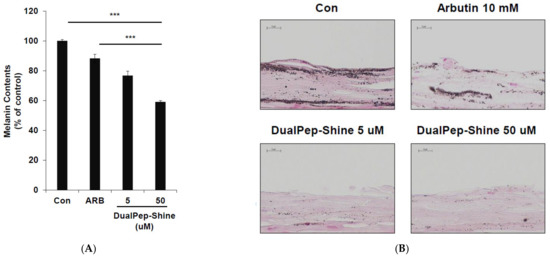 Next, we assessed the melanin-inhibiting effect of DualPep-Shine in a 3D human skin model [33,34,35]. As 3D human skin (Neoderm-ME) contains human keratinocytes and melanocytes and shows melanogenesis over time, we measured the melanin content in Neoderm-ME after incubation with different concentrations of DualPep-Shine or Arbutin (a known regulator of melanin synthesis) for 6 days. We found that DualPep-Shine reduced the melanin content in a dose-dependent manner and attenuated melanin synthesis to a greater extent than Arbutin, suggesting its superiority in inhibiting melanin synthesis (Figure 4A). Additionally, the tissue section images obtained via Fontana–Masson staining show that the melanin deposition in tissue was profoundly decreased by DualPep-Shine treatment (Figure 4B). Moreover, we used FITC-conjugated DualPep-Shine to validate the skin-penetrating ability of DualPep-Shine. After treating the FITC-conjugated DualPep-Shine for 24 h, confocal images were analyzed to check the penetration of DualPep-Shine. Consistent with the Franz cell assay using artificial skin, FITC-DualPep-Shine penetrated the skin and was detected in the lower part of the epidermis (Figure 4C). Based on these results, we concluded that DualPep-Shine could penetrate the epidermis and inhibit melanin synthesis in a 3D human skin model, suggesting DualPep-Shine would reduce melanin production on human skin.