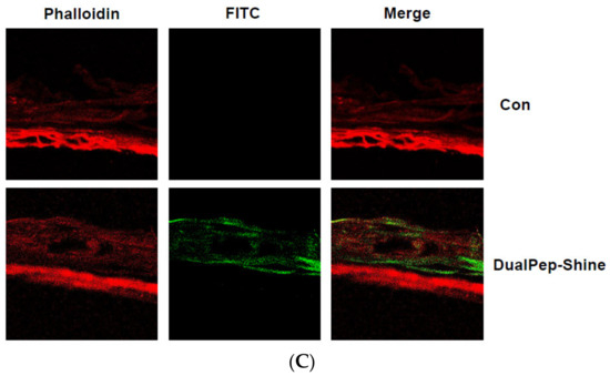 B16F10 cells were seeded in a 24-well plate and treated with 2.5 μM of FITC conjugated TAT, RMNE1, or DualPep-Shine for 2 h. After washing the cells with PBS 3 times, 150 μL of trypsin was used to remove membrane-bound peptides. An excess amount of serum-containing medium was added to neutralize the trypsin and was washed with FACS buffer containing 1% bovine serum albumin (BSA) and 0.1% sodium azide. Penetrated peptides were evaluated via flow cytometry by measuring FITC levels. B16F10 cells were seeded in a 24-well plate containing a glass coverslip to check the localization of the penetrated peptides. The cells were treated with FITC-conjugated peptides for 2 h and stained with Hoechst 33342 (Thermo Fisher Scientific, Waltham, MA, USA) for 5 min. The cells were washed again with PBS five times, mounted on a slide glass using gel/mount solution (Biomeda, Foster City, CA, USA), and the penetrated peptides were visualized using a fluorescence microscope [52]. To test the penetrating ability on Neoderm-ME, FITC-conjugated peptides were treated on Neoderm-ME for 24 h. After washing with PBS for three times, the tissues were fixed, frozen in OCT compound, and sectioned. The slides were washed with water before staining with Hoechst 33342 for 5 min. Sample images were taken using a confocal microscope.