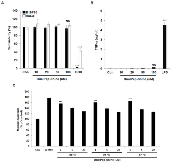 DualPep-Shine shows high stability with little toxicity. (A) B16F10 and HaCaT cells were treated with the indicated concentration of DualPep-Shine for 72 h, and relative cell viability was measured using Cell Counting Kit 8 (CCK8) assay. Doxorubicin was used for positive control. (B) Phorbol 12-myristate 13-acetate (PMA)-differentiated THP-1 cells were treated with different concentrations of DualPep-Shine for 24 h. TNF-α from supernatants was measured using the enzyme-linked immunosorbent assay (ELISA). (C) DualPep-Shine was incubated with indicated temperature conditions for 45 days. B16F10 cells were treated with different concentrations for 72 h, and melanin contents were measured at OD 405 nm. The results are presented as mean ± SD, and statistical significance was analyzed with Student’s t-test (NS: not significant, *** p < 0.001).