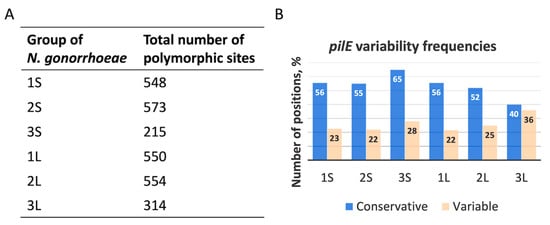 The analyzed isolates of N. gonorrhoeae were divided to three groups (Table S4): (1) containing the ngmutS or ngmutL gene with the assigned allele; (2) containing the ngmutS or ngmutL gene with unassigned allele; (3) without the gene of interest. Depending on the type of gene—ngmutS (S) or ngmutL (L), these groups were designated as 1S or 1L, 2S or 2L, and 3S or 3L, respectively. We analyzed the variability of the pilE in each group using the “BLAST” plugin of the PubMLST database. The pilE nucleotide sequence of MS11 N. gonorrhoeae was used as a consensus (UniProtKB/Swiss-Prot: P02974.2). Next, the nucleotide sequences of the pilE gene of each group were exported to FASTA for alignment using the ClustalW algorithm. The alignment results were re-stored in Jalview and analyzed in Python to define the frequency of variations for each pilE position. The output TXT files after calculation were converted into Excel tables containing information about pilE polymorphisms for further analysis. A site of polymorphism is the position, the nucleotide of which differs in the gene of at least one isolate among all analyzed isolates. Conservative positions are positions whose nucleotide is retained more often than in 90% of cases among the genomes of all analyzed isolates. Variable positions are those positions whose nucleotide is retained less frequently than in 75% of cases among the genomes of all analyzed isolates. Statistical analysis (Student’s t-test) was performed to identify a statistically significant difference in mean variability between groups.