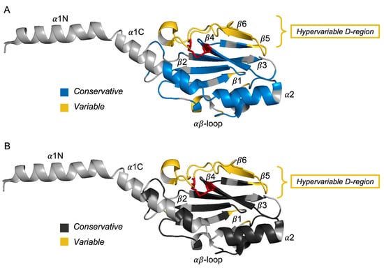 Almost all hypervariable PilE positions from both ngmutS- and ngmutL-deficient groups are located in the surface-exposed areas within the D-region between two conserved cysteine residues (marked with sticks and highlighted in red in Figure 2) [] and in the αβ loop. Low prevalence polymorphisms are scattered throughout the β-sheet domain and are shown in blue and gray for ngmutS- and ngmutL-deficient groups of N. gonorrhoeae isolates, respectively.