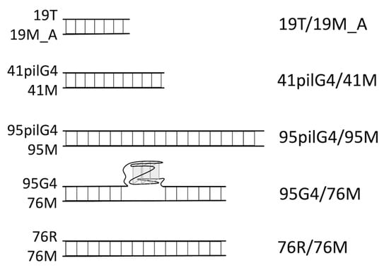 We used synthetic DNA oligonucleotides of various lengths containing the pilE G4 motif flanked by the same sequences as in the N. gonorrhoeae genome, which are presented in Table 1 along with complementary oligomers (marked by symbol M) and respective control models. The DNA duplexes formed by hybridization of the oligonucleotides listed in Table 1 and their abbreviations are shown in Figure 3.
