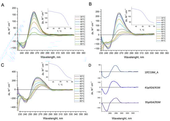 The observed differences between the sets of CD spectra of oligonucleotides having various lengths are explained by the increasing influence of single-stranded unstructured sequences flanking the quadruplex structure during the transition from 19pilG4 to the 95pilG4. The same factor determines the drop in the melting temperature (Tm) from more than 77 ± 1 for 19pilG4 to 66 ± 1 for 41pilG4 and then to 63 ± 1 °C for 95pilG4 due to an increase in the unfavorable entropy contribution. As expected, the addition of the complementary strand (95M) to 95pilG4 causes dramatic changes in the CD spectrum, which displays a peak near 280 nm, where the signals of unstructured oligonucleotides and B-DNA with an average G/C content are located (Figure 4D). This long oligonucleotide forms a duplex structure at 37 °C even in the buffer containing 100 mM KCl, which promotes G4 folding. Regarding the structure formed by the shorter 41pilG4 and fully complementary DNA strand (41M), the positive CD band at 270 nm can be assigned to either a G-rich DNA duplex or a duplex with a partially preserved quadruplex structure (Figure 4D). A number of studies have shown that the G4–DNA duplex equilibrium depends on many factors that affect the relative stability of both secondary structures, in particular, on the length of G4 flanking sequences; it has been demonstrated that the propensity to attain a G4 structure decreases with increasing length of the flanks []. Accordingly, to create a 19 bp duplex, we had to introduce four G→T substitutions into the extremely stable 19pilG4 to prevent G4 formation. The resulting 19T was hybridized with 19M_A to give a 19T/19M_A duplex structure (Figure 4D).