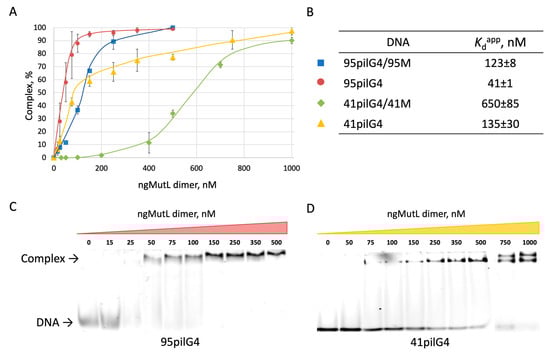 Since the DNA-binding activity of MutL, one of the principal components of the mismatch repair pathway, is highly dependent on DNA length, we evaluated the effect of pilE G4 on recognition and binding to ngMutL using the synthetic oligonucleotides 19pilG4, 41pilG4, and 95pilG4, which differ in the length of quadruplex-flanking regions (Table 1). Double-stranded versions of these DNA fragments, stabilized by 19, 41, and 95 base pairs, respectively (Figure 3), were used as related ngMutL substrates. Complex formation between the ngMutL protein and the entire set of DNA ligands bearing the TAMRA fluorophore at the 3′ end of the oligonucleotide strand (indicated in Table 1) was monitored by electrophoretic mobility shift assay (EMSA). Figure 5 shows binding curves of ngMutL to 41- and 95-nt DNAs containing pilE G4 and the corresponding duplex structures of the same length in dependence on the total protein concentration, as well as the values of apparent dissociation constants (Kdapp) calculated from EMSA data, and a representative polyacrylamide gel images of ngMutL binding to 95pilG4 and 41pilG4.