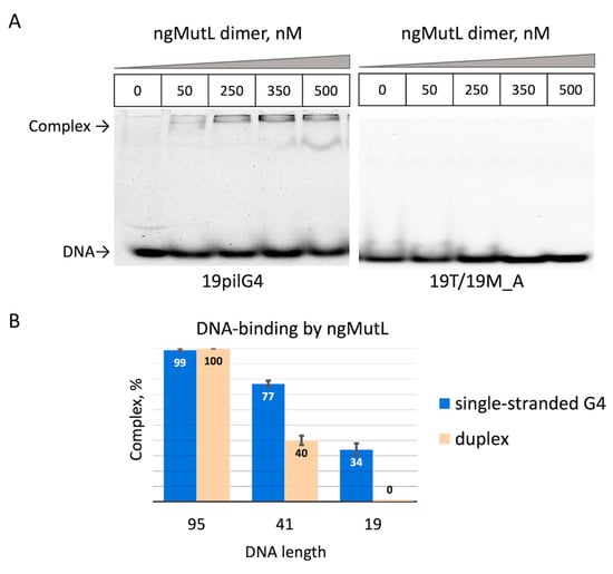 It should be noted that we were unable to calculate the Kdapp value for ngMutL binding to the 19pilG4 oligonucleotide due to a dramatic decrease in ngMutL affinity to this short DNA ligand []. However, the formation of a nucleic acid–protein complex (~30%) was observed at a 25-fold excess of the ngMutL dimer relative to 19pilG4 (Figure 6A). At the same time, no interaction of ngMutL with double-stranded 19T/19M_A was observed under the same binding conditions (Figure 6A). In order to evaluate the efficiency of the ngMutL complex formation with 95-, 41-, and 19-mer DNA ligands (both single- and double-stranded) and to compare the effect of ligand length and composition (absence or presence of the G4 structure) on this process, we used the same conditions, which are presented in the legend of Figure 6.