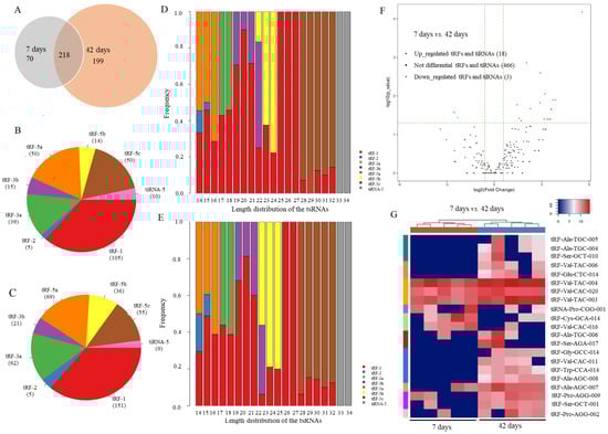 Expression pattern of tsRNAs in Drosophila at 7 days and 42 days. (A) newly discovered and known tsRNAs; (B) classification of tsRNAs at 7 days; (C) classification of tsRNAs at 42 days; (D) subtype length of tsRNAs at 7 days; (E) subtype length of tsRNAs at 42 days; (F) significantly up/downregulated tsRNAs between 7 days and 42 days; (G) heatmap of 21 differentially expressed tsRNAs.