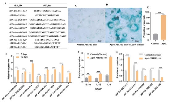 Verification of 10 differentially expressed tRFs in Drosophila and aged mouse NIH3T3 cells. (A) The sequences of 10 differentially expressed tRFs; (B) the expression levels of 10 differentially expressed tRFs of Drosophila at 7 days and 42 days; (C) β-gal staining of normal mouse NIH3T3 cells without adriamycin (ADR); (D) β-gal staining of aged mouse NIH3T3 cells induced by ADR; (E) the number of β-gal-stained cells in normal and aged mouse NIH3T3 cells. (F) the expression levels of IL-1α, IL-1β, and IL-6; (G) 5 tRFs in normal and aged mouse NIH3T3 cells induced by ADR. ADR—adriamycin; SASP—senescence-associated secretory phenotypes; **, p < 0.01; ***, p < 0.001; ns—no significance.
