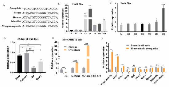 Expression features of tRF-Trp-CCA-014 in Drosophila and mice. (A) The sequence alignment of tRF-Trp-CCA-014 in Drosophila, mouse (a relational database of transfer RNA related fragments 3002a, tRFdb 3002a), human (from MINTbase v2.0), zebrafish (tRFdb 3038), and Xenopus tropicalis (tRFdb 3015); (B) the expression level of tRF-Trp-CCA-014 in larvae and adults; (C) the expression level of tRF-Trp-CCA-014 in more adult ages; (D) the expression level of tRF-Trp-CCA-014 in 49-day-old fruit flies; (E) the expression level of tRF-Trp-CCA-014 in the nucleus and cytoplasm of mouse NIH3T3 cells; (F) the expression level of tRF-Trp-CCA-014 in different tissues of mice. E—egg; L1—the first instar larva; L2—the second instar larva; L3—the third instar larva; P—pupa; d—days. *, p < 0.05; **, p < 0.01; ***, p < 0.001; ns—no significance.