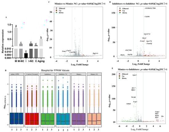 Differentially expressed genes (DEGs) identified by RNA-seq after transfection of tRF-Trp-CCA-014 in mouse NIH3T3 cells. (A) The expression level of tRF-Trp-CCA-014 in Mimics, Mimic NC, Inhibitors, Inhibitor NC, Aging (adriamycin (ADR)), and Control (Normal) groups; (B) boxplot for FPKM values in different groups; (C–E) the significantly up/downregulated DEGs among Mimics vs. Mimic NC groups, Inhibitors vs. Inhibitor NC groups, and Mimics vs. Inhibitors groups. In (A), different small letters indicate significant differences at p < 0.05 level.