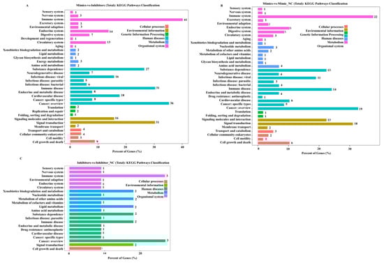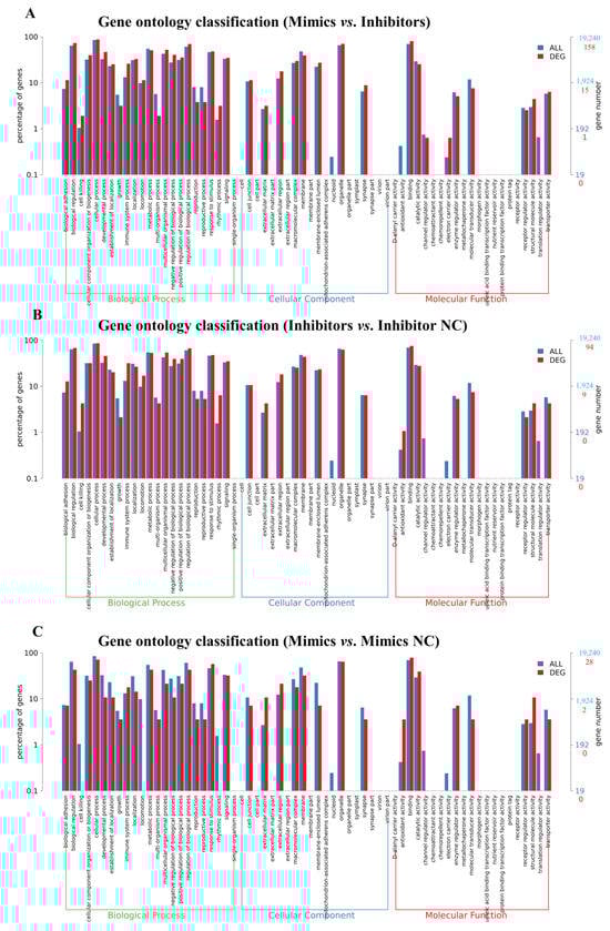 KEGG and GO enrichment analyses of the identified DEGs were performed. The overlapping KEGG signalling pathways (Dataset S4) were enriched in cellular processes, environmental information, genetic information processing, human diseases, metabolism, and organismal systems among Mimics vs. Inhibitors groups (Figure 5A), Mimics vs. Mimic NC groups (Figure 5B), and Inhibitors vs. Inhibitor NC groups (Figure 5C). The signalling pathways associated with the most DEGs focused on the immune system, cancer: overview, and signal translation. Furthermore, the results showed that most DEGs were enriched in similar biological processes in GO analysis (Dataset S3) among Mimics vs. Inhibitors groups (Figure 6A), Inhibitors vs. Inhibitor NC groups (Figure 6B), and Mimics vs. Mimic NC groups (Figure 6C). The most enriched biological process terms included “biological regulation”, “cellular process”, “metabolic process”, “regulation of biological process”, and “signalling”; the cellular component terms included “macromolecular complex”, “membrane”, “membrane-enclosed lumen”, and “organelle”; the molecular function terms included “binding”, “catalytic activity”, “molecular transducer activity”, and “transporter activity”.