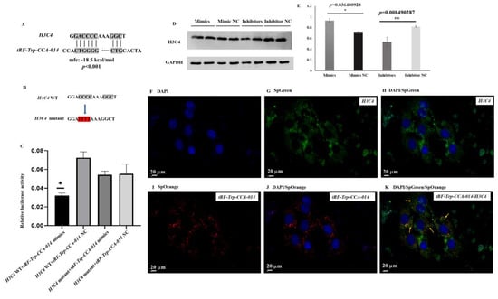 Analysis of the tRF-Trp-CCA-014-H3C4 network in mouse NIH3T3 cells. (A) Binding sites between tRF-Trp-CCA-014 and H3C4; (B) mutant sites of the H3C4 3′UTR; (C) binding properties of tRF-Trp-CCA-014-H3C4 by dual luciferase reporter gene assay in 293T cells. (D) H3C4 protein expression level after transfection with tRF-Trp-CCA-014 mimics, negative control of tRF-Trp-CCA-014 mimics, tRF-Trp-CCA-014 inhibitors, and negative control of tRF-Trp-CCA-014 inhibitors in mouse NIH3T3 cells by Western blot. (E) quantification of protein bands in Figure 7D; (F) DAPI; (G) SpGreen for H3C4; (H) merged fluorescent images of (F,H); (I) SpOrange for Trp-CCA-014; (J) merged fluorescent images of (F,I); (K) merged fluorescent images of (F,G,I). NC—negative control; UTR—untranslated region; *, p < 0.05; **, p < 0.01.