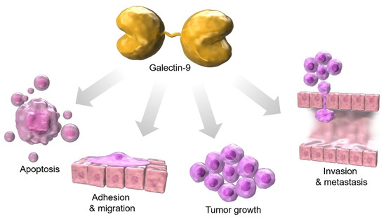 Figure 1. Galectin-9 is associated with apoptosis, adhesion, migration, tumor growth, invasion, and metastasis during cancer development.