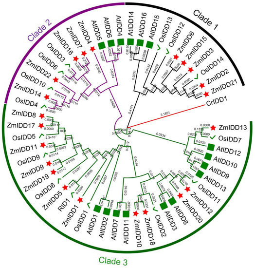 Phylogenetic tree of full-length ZmIDD, AtIDD, and OsIDD proteins using the Maximum Likelihood method based on the JTT matrix-based model. The tree is drawn to scale, with branch lengths measured in the number of substitutions per site. The analysis involved 54 amino acid sequences. All positions containing gaps and missing data were eliminated. There were a total of 94 positions in the final dataset. The different colored arcs indicate subfamilies of the IDD proteins. Different colored shapes represent IDDs from maize (☆), rice (√), and Arabidopsis (☐). IDD in Chlamydomonas reinhardtii was selected as an outgroup.