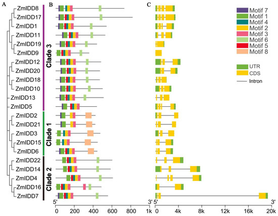 Phylogenetic relationships, architecture of conserved protein motifs, and gene structure in IDD genes from maize. (A) The phylogenetic tree was constructed based on the full-length sequences of maize IDD proteins using MEGA version 7.0 software. (B) The motif compositions of 22 ZmIDD proteins. The motifs were identified using the MEME program. Boxes of different colors represent motifs 1 to 10. The length of the amino acid sequences can be estimated by the scale at the bottom. (C) Gene structures of 22 ZmIDD genes. Yellow boxes represent exons, green boxes represent 5′ or 3′ untranslated regions (UTR), and black lines represent introns. The length of nucleotide sequences of exons/introns/UTRs can be estimated by the scale at the bottom.