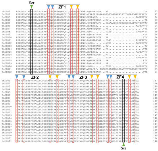 Comparative amino acid sequence alignment of INDETERMINATE DOMAIN (IDD) genes that shows motifs or domains that are conserved in maize. Black boxes mark the positions of cysteines (C, in blue triangles) and histidines (H, in yellow triangles) characterized for each zinc finger.
