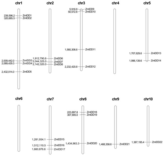 Distribution of ZmIDD genes in maize chromosomes. The chromosome numbers are indicated at the top of each chromosome image.