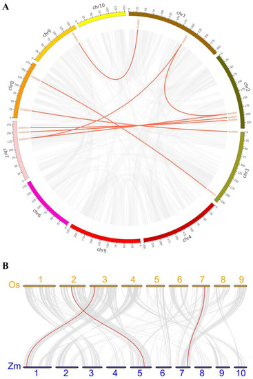 The synteny analysis of ZmIDD family genes. (A) The synteny analysis of the ZmIDD family in maize. Gray lines indicate all synteny blocks in the maize genome. The genes linked by red lines represent homologues. (B) Synteny analysis of IDD genes between maize and rice. Gray lines: all collinear blocks within maize and other plant genomes. Red lines: the synteny of IDD gene pairs. The species names with the prefixes Zm and Os indicate maize and rice, respectively.