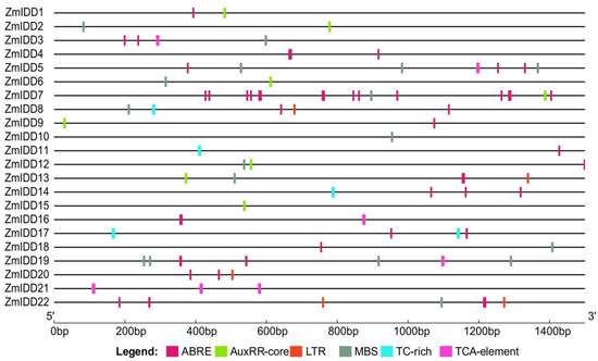 Predicted cis-regulatory elements in ZmIDD promoters. Promoter sequences (about 1.5 kb) of 22 ZmIDD genes were analyzed by PlantCARE. The upstream length to the translation starting site can be inferred according to the scale at the bottom.