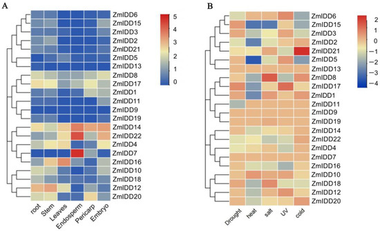 Expression profiles of the ZmIDD genes. (A) Expression profiles of the ZmIDD genes in different tissues. The color scale represents expression data with a row scale. Blue: low expression; red: high expression. (B) Expression profiles of the ZmIDD genes under different abiotic stresses. Expression data were the ratios to control values. The color scale represents expression levels from upregulation (red) to downregulation (blue).