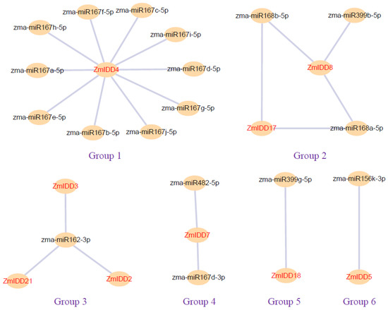 To determine whether a miRNA-mRNA regulatory network exists in maize, 321 known miRNAs were scanned. Finally, 22 miRNAs were predicted to inhibit the transcription level of ZmIDDs (Figure 10; Table S13). In short, miRNA-targeted ZmIDDs were divided into 5 networks: group 1/4/5/6 involving ZmIDD 4/7/18/5, respectively; group 2 involving two ZmIDDs (ZmIDD8 and ZmIDD17); and group 3 involving three ZmIDDs (ZmIDD 2/3/21) (Figure 10; Table S13).