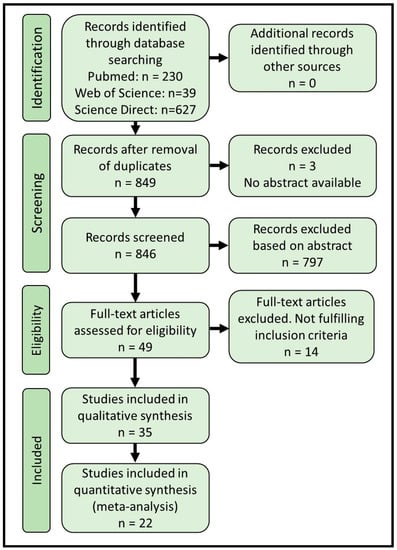 The systematic review followed PRISMA guidelines [,]. PRISMA abstract and article checklists for the current study are completed and available in Supplementary Tables S1 and S2. Through systematic searches in PubMed, Science Direct, and Web of Science, we identified 896 abstracts, with 849 remaining after removal of duplicates (Figure 1). We screened 846 records (3 were unavailable) and excluded 797 based on abstract content, leaving 49 articles for full-text screening, where 14 articles were excluded during full-text examination. In total, we were able to include 22 articles in the meta-analysis (Table 1) and an additional 13 articles in the qualitative part of the systematic review (Table 2), giving a final number of 35 original articles on which the systematic review and meta-analysis were based (Figure 1).