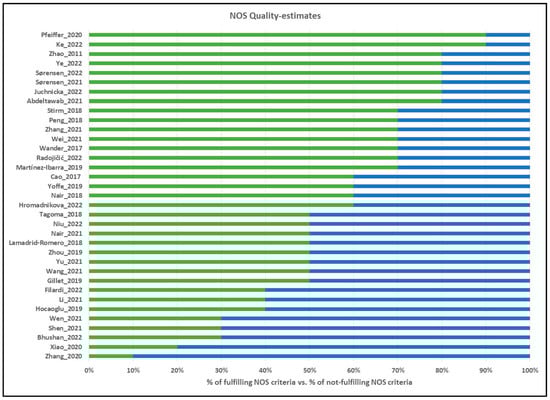 Quality evaluations of the included studies according to the NOS Scale. Green scale (right side) corresponds to the percentage of NOS scale points fulfilled, and blue scale (left side) corresponds to the percentage of NOS scale points not fulfilled. References for evaluated studies: Pfeiffer et al. (2020) [], Ke et al. (2022) [], Zhao et al. (2011) [], Ye et al. (2022) [], Sørensen et al. (2022) [], Sørensen et al. (2021) [], Juchnicka et al. (2022) [], Abdeltawab et al. (2022) [], Stirm et al. (2018) [], Peng et al. (2018) [], Zhang et al. (2021) [], Wei et al. (2021) [], Wander et al. (2017) [], Radojičić et al. (2022) [], Martinez-Ibarra et al. (2019) [], Cao et al. (2017) [], Yoffe et al. (2019) [], Nair et al. (2018) [], Hromadnikova et al. (2022) [], Tagoma et al. (2018) [], Niu et al. (2022) [], Nair et al. (2021) [], Lamadrid-Romero et al. (2018) [], Zhou et al. (2019) [], Yu et al. (2021) [], Wang et al. (2021) [], Gillet et al. (2019) [], Li et al. (2021) [], Hocaoglu et al. (2019) [], Wen et al. (2021) [], Shen et al. (2021) [], Bhushan et al. (2022) [], Xiao et al. (2020) [], Zhang et al. (2020) [].