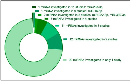 Diversity in the reported circulating miRNAs investigated in relation to GDM pregnancies. Twenty-two miRNAs were reported to be investigated in three or more original studies, while the majority of investigated miRNAs (n = 92 miRNA species) were only investigated in one original study.