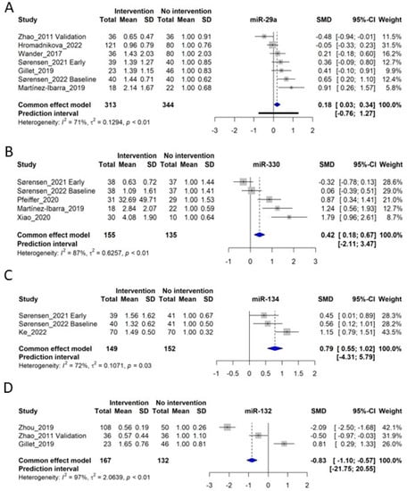 Forest plots of the fixed-effect meta-analysis of (A) miR-29a [,,,,,,], (B) miR-330 [,,,,], (C) miR-134 [,,], and (D) miR-132 [,,].