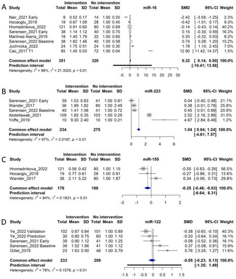 Forest plots of the fixed-effect meta-analysis of (A) miR-16 [,,,,,,,], (B) miR-223 [,,,,], (C) miR-155 [,,], and (D) miR-122 [,,,].