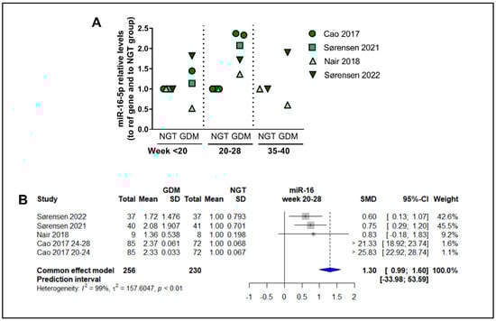 Overall temporal regulation of the circulating levels of miR-16-5p throughout gestation: (A) Circulating levels of miR-16-5p at <20 weeks, 20–28 weeks, and 35–40 weeks of gestation, plotted for Cao et al., 2017 [], Sørensen et al., 2021 [], Nair et al., 2018 [], and Sørensen et al., 2022 [], calculated relative to levels in nondiabetic control women matched for gestational age. (B) Main-effects meta-analysis for circulating levels of miR-16-5p at gestational weeks 20–28.