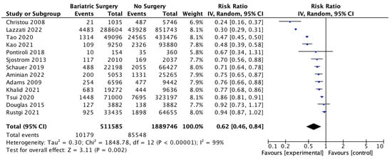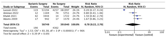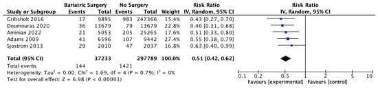 Five studies reported on the incidence of cancer-related mortality, with 37,233 patients in the bariatric surgery cohort compared to 297,789 in the control group. Bariatric surgery was associated with a significant reduction in the incidence of cancer-related mortality (RR 0.51, 95% CI 0.42–0.62, p < 0.00001). There was no heterogeneity observed across the studies (Chi2 = 1.69, p = 0.79, I2 = 0) (Figure 5).