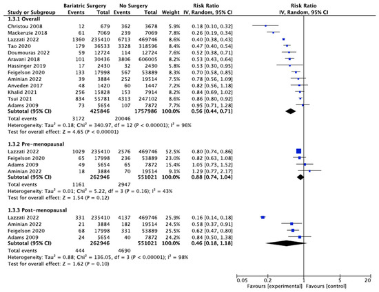 Further subgroup analyses were performed using data from four of the studies that examined the incidence of both premenopausal and postmenopausal breast cancer in 262,946 patients who received bariatric surgery and 551,021 control patients [38,39,49,56]. There was a nonsignificant reduced incidence of postmenopausal breast cancer (RR 0.46, 95% CI 0.18–1.18, p = 0.10) and no significant risk reduction for premenopausal breast cancer (RR 0.88, 95% CI 0.74–1.04, p = 0.12) in obese women who received bariatric surgery. There was moderate heterogeneity for the premenopausal breast cancer analysis (Chi2= 5.22, p = 0.16, I2 = 43%), and high heterogeneity for the postmenopausal breast cancer analysis (Chi2= 136.05, p = 0.00001, I2 = 98%) (Figure 6).