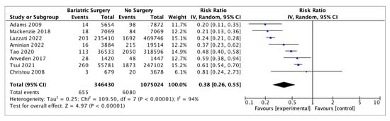 Eight studies reported on endometrial cancer incidence, with 346,430 female patients in the bariatric surgery cohort compared to 1,075,024 female patients in the control group. Bariatric surgery was associated with a significant reduction in the incidence of endometrial cancer (RR 0.38, 95% CI 0.26–0.55, p < 0.00001). There was statistically significant heterogeneity across the studies (Chi2 = 109.50, p <0.00001, I2 = 94%) (Figure 7).