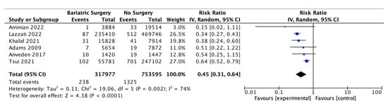Six of the studies reported on the incidence of ovarian cancer, with 317,977 female patients in the bariatric surgery cohort compared to 753,595 female patients in the control group. Bariatric surgery was associated with a significant decrease in the incidence of ovarian cancer (RR 0.45, 95% CI 0.31–0.64, p < 0.0001). There was significant heterogeneity between the studies (Chi2 = 19.06, p = 0.002, I2 = 74%) (Figure 8).