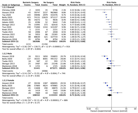 However, in the sensitivity analysis (Table A9), with removal of the study by Mackenzie et al. (2018), the results were substantially different [45]. There was an overall significant CRC risk reduction with bariatric surgery (RR 0.63, CI 0.50–0.81, p = 0.0002) but with persistent significant heterogeneity (Chi2 = 118.56, p < 0.00001, I2 = 91%). The risk reduction was now similar between males (RR 0.59, 95% CI 0.40–0.87, p = 0.008) and females (RR 0.61, 95% CI 0.44–0.84, p = 0.002). There was considerable heterogeneity between the five studies for both males (Chi2 = 15.53, p = 0.004, I2 = 74%) and females (Chi2 = 32.13, p < 0.00001, I2 = 88%) (Figure 9). This remained in the four pooled studies for both male data (Chi2 = 11.89, p = 0.008, I2 = 75%) and female data (Chi2 = 14.79, p = 0.002, I2 = 80%) after the study by Mackenzie et al. [45] was excluded (Figure A21).