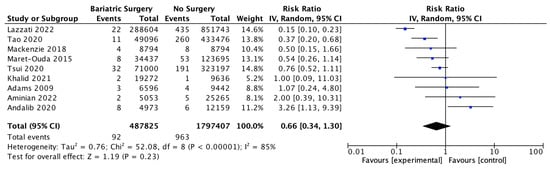 Nine studies investigated the incidence of oesophageal adenocarcinoma, with 487,825 patients in the bariatric surgery cohort compared to 1,797,407 in the control group. Bariatric surgery was associated with a nonsignificant reduction in the incidence of oesophageal adenocarcinoma (RR 0.66, 95% CI 0.34–1.30, p = 0.23). There was significant heterogeneity between the studies (Chi2 = 52.08, p < 0.00001, I2 = 85%) (Figure 10).