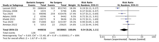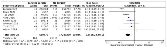 Eight studies assessed the impact of bariatric surgery on HCC, with 619,870 patients in the bariatric surgery cohort compared to 17,239,239 in the control group. Bariatric surgery was associated with a significant reduction in the incidence of HCC (RR 0.35, 95% CI 0.22–0.55, p < 0.00001). There was significant heterogeneity across the studies (Chi2 = 59.80, p < 0.00001, I2 = 88%) (Figure 11).