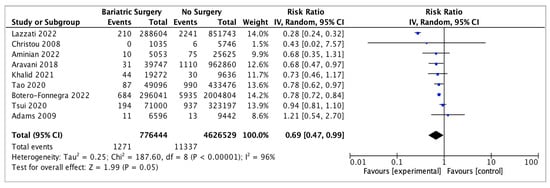 Nine studies reported on kidney cancer incidence, with 776,444 patients in the bariatric surgery cohort compared to 4,626,529 in the control group. Bariatric surgery was associated with a nonsignificant reduction in the risk of kidney cancer (RR 0.69, 95% CI 0.47–0.99, p = 0.05). There was significant heterogeneity across the studies (Chi2 = 187.60, p < 0.00001, I2 = 96%) (Figure 12).