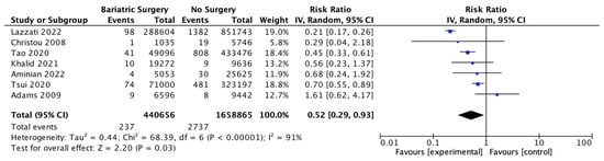 Seven studies reported pancreatic cancer incidence, with 440,656 patients in the bariatric surgery cohort compared to 1,658,865 in the control group. Bariatric surgery was associated with a significant reduction in the risk of developing pancreatic cancer (RR 0.52, 95% CI 0.29–0.93, p = 0.03). There was significant heterogeneity across the studies (Chi2 = 68.39, p < 0.00001, I2 = 91%) (Figure 13).