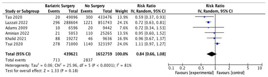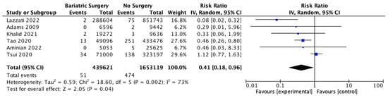 Six studies reported on gal1bladder cancer, with 439,621 patients in the bariatric surgery cohort compared to 1,653,119 in the control group. Bariatric surgery was associated with a significant reduction in the incidence of gallbladder cancer (RR 0.41, 95% CI 0.18–0.96, p = 0.04). There was statistically significant heterogeneity across the studies (Chi2 = 18.60, p = 0.002, I2 = 73%) (Figure 14).