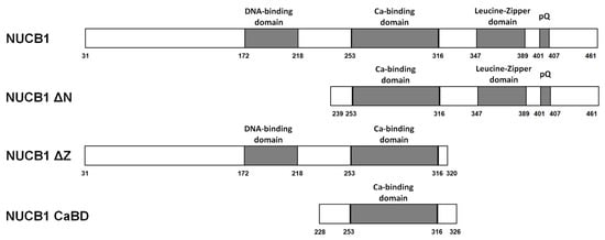 - Miura, K.; Titani, K.; Kurosawa, Y.; Kanai, Y. Molecular cloning of nucleobindin, a novel DNA-binding protein that contains both a signal peptide and a leucine zipper structure. Biochem. Biophys. Res. Commun. 1992, 187, 375–380. [Google Scholar] [CrossRef] [PubMed]