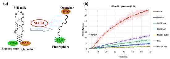 In our experiments, a molecular beacon was used which contained the sequence of miR-200a-3p with FAM (fluorophore) at the 5′-end and RTQ (quencher) at the 3′-end of the RNA hairpin (MB-miR). Upon addition of NUCB1 to the MB-miR solution in a 1:10 molar ratio, fluorescence significantly increased in one hour (Figure 4b). The shape of the melting curve was not changed by 5-fold excess of NUCB1 over MB-miR, but the fluorescence intensity was 1.5-fold lower.