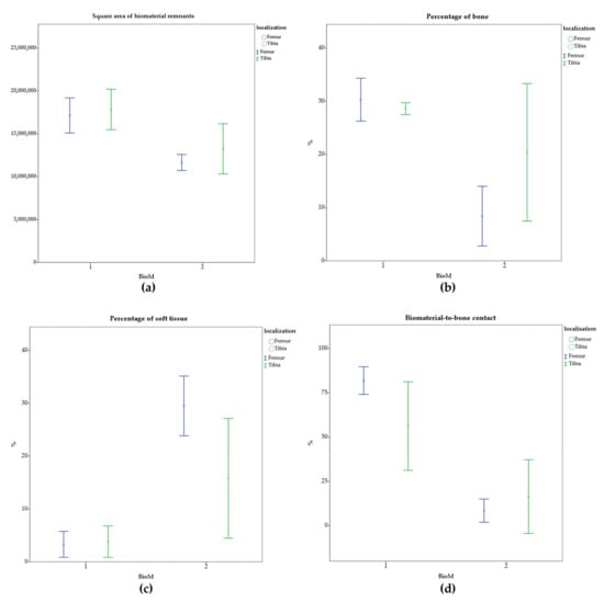 In the present study, the bone-to-biomaterial contact was also evaluated at the bone interface. It was found that BioM1 showed a bone-to-biomaterial ratio of 81.9% in the femur and 56.2% in the tibia (p = 0.005). In contrary, BioM2 showed a bone-to-biomaterial contact of only 8.5% in the femur and 16.4% in the tibia. The results for both biomaterials are displayed in Figure 1d.