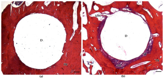 Representative decalcified and stained histological sections of BioM1 and BioM2: (a) defects (D) filled with BioM1 revealed a homogeneous bone-to-biomaterial interface with no signs of fibrous encapsulation; (b) defects filled with BioM2 are characterized by a pronounced enclosure with fibrous tissue (purple, ST). Further, osteolytic zones (OL) and univacular fat cells (UFC) are additionally present within the bone-to-biomaterial interface of implanted BioM2. Scale bar 500 µm. (PB: peripheral bone).