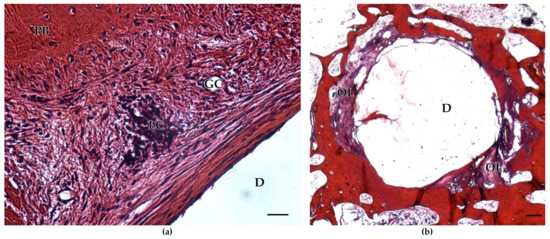 Histological sections of implanted BioM2: (a) surrounding tissue shows infiltration by lymphocytes (LC) and giant cells (GC) (left image). Peripheral bone (PB) is present in the left upper corner of the defect site (D). Scale bar 50 µm; (b) osteolytic zones (OL) filled with fibrous tissue and inflammatory signs are present in the interface regions. Scale bar 1000 µm.