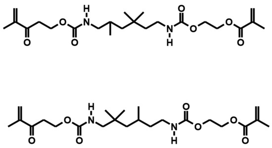 In the present animal study, two light curable biomaterials, BioM1 based on urethane dimethacrylate and BioM2 based on tri-armed oligoester-urethane methacrylate (BioM2) were applied. Both investigated biomaterials, BioM1 and BioM2, additionally contained β-tricalcium phosphate microparticles loaded with 20 wt% of the photosensitizer mTHPC. All chemicals were obtained from Sigma-Aldrich Chemie GmbH, Taufkirchen, Germany. The photosensitizer mTHPC was kindly provided by biolitec research GmbH, Jena, Germany. The biomechanical and antimicrobial photodynamic properties of both materials were evaluated by our group in a previous examination [32]. Structural formulas of the applied polymers (urethane dimethacrylate—BioM1, tri-armed oligoester-urethane methacrylate—BioM2) are presented below (Figure 5 and Figure 6).